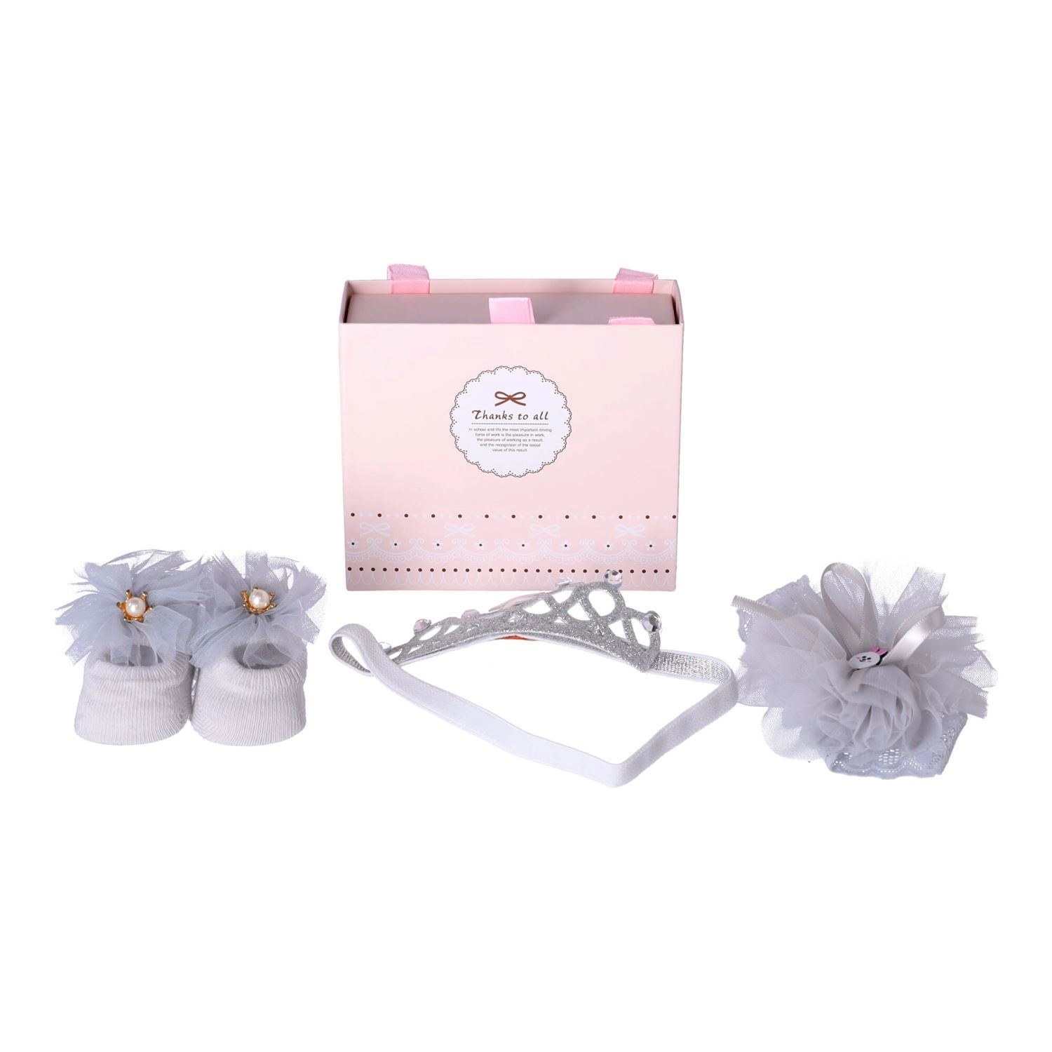 Een betoverende 3-in-1 cadeauset voor pasgeborenen met twee comfortabele haarbanden en bijpassende schoentjes/sokjes, alles in een zachte lichtgrijze tint. Ideaal voor doop, welkom-baby of babyshower. Dankzij het zachte en elastische materiaal van de haarbanden drukt het niet op het hoofdje en zorgt de stijlvolle afwerking voor een bijzonder accent bij elke outfit. De set wordt geleverd in een decoratieve cadeauverpakking, klaar om direct te geven.