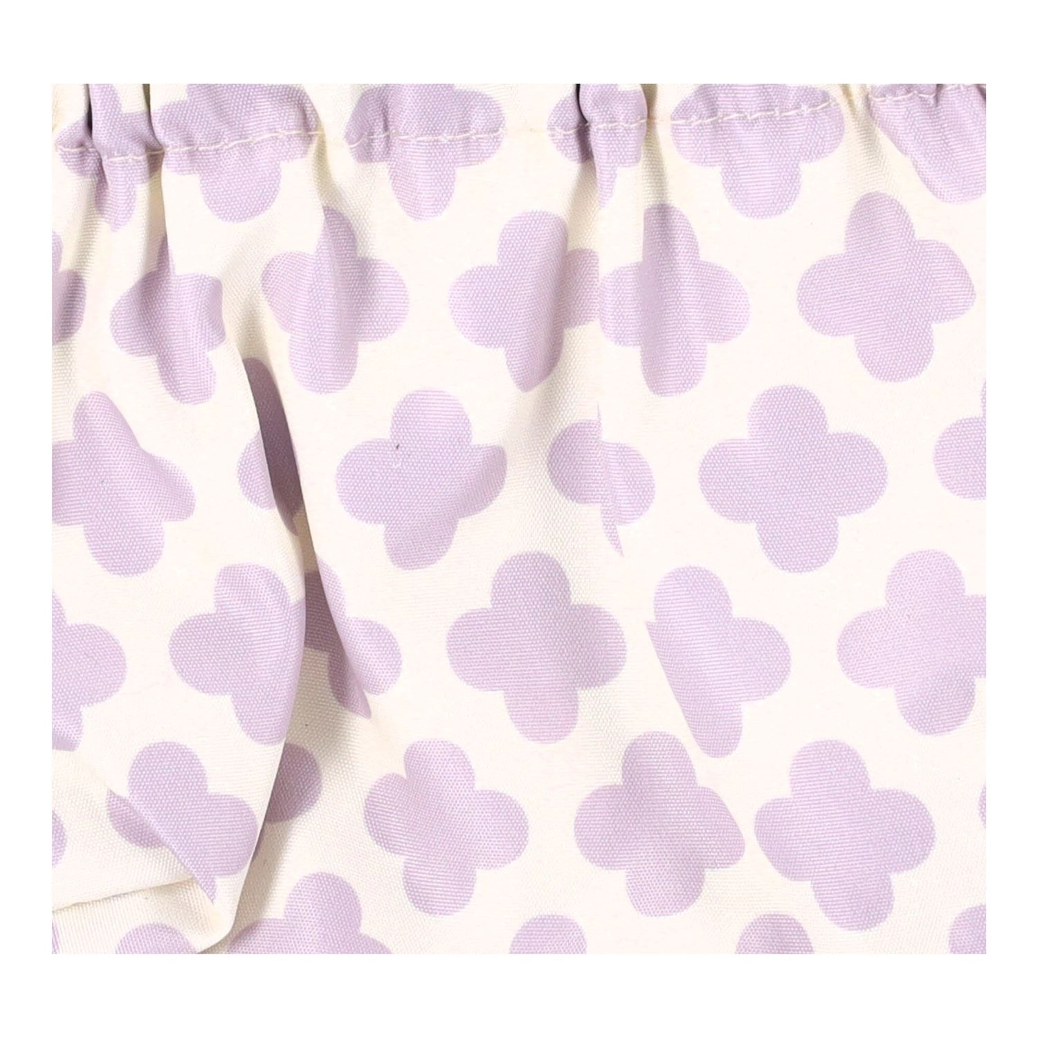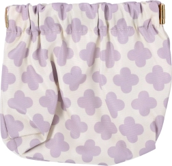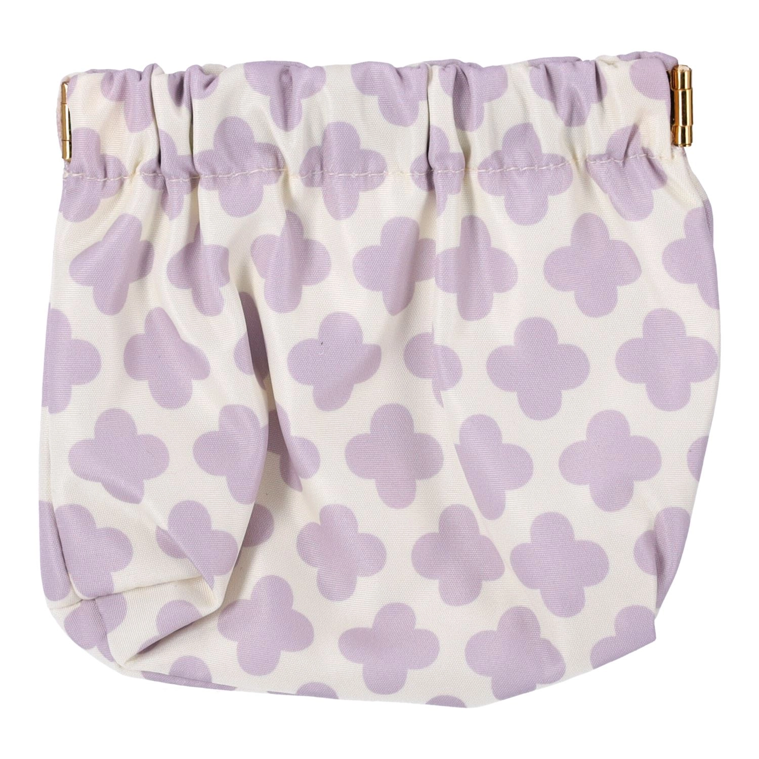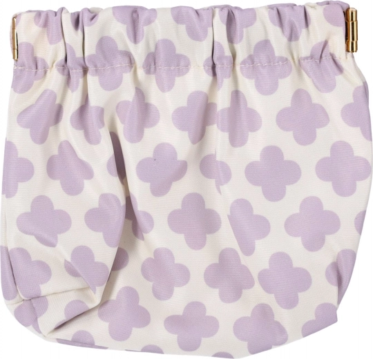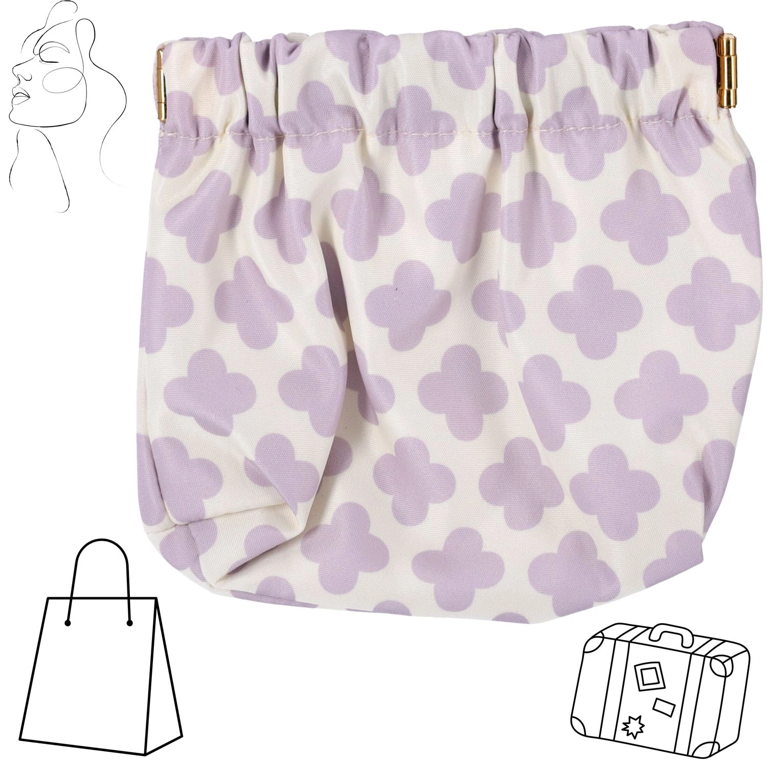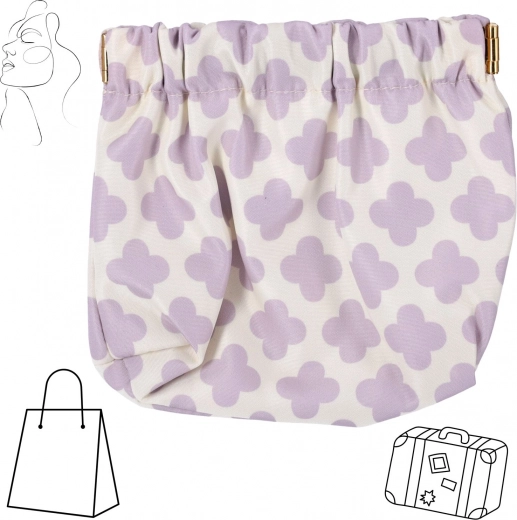 Het tasje is gemaakt van hoogwaardige textiel met een subtiel, vrouwelijk patroon in lavendel op een witte achtergrond. De elastische aansnoersluiting maakt snel openen en betrouwbaar sluiten mogelijk, zodat de inhoud niet uitvalt. Het is licht, zacht en behoudt uitstekend zijn vorm.