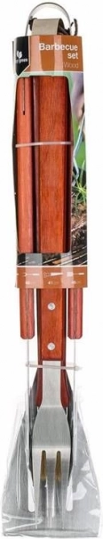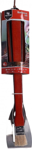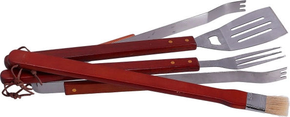 De 4-delige set barbecuegereedschap bevat een borstel, tang, spatel en vork van roestvrij staal. De set omvat de basisgereedschappen die nodig zijn voor het barbecueën. Het gereedschap wordt geleverd met een oogje om op te hangen.