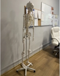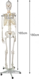 Het skeletmodel meet 165 cm alleen en 180 cm met de bijgevoegde standaard, wat overeenkomt met de realistische grootte van een volwassen persoon.