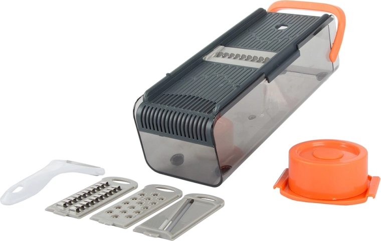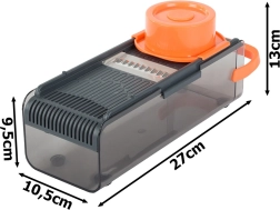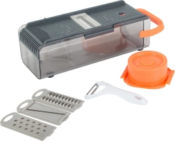 De multifunctionele snijder en rasp is ontworpen om uw dagelijks koken te vergemakkelijken. Het wordt geleverd met vier verwisselbare opzetstukken die aan verschillende behoeften in uw keuken voldoen. De transparante container met deksel maakt gemakkelijke opslag van ingrediënten in de koelkast mogelijk zonder hun versheid te verliezen.
