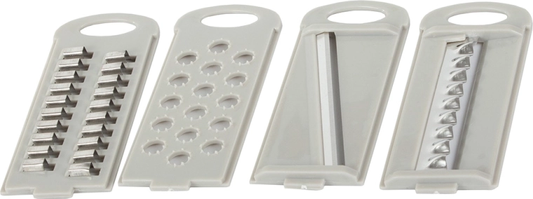 Vier verwisselbare opzetstukken voor verschillende snij- en raspmogelijkheden. Aanpasbaar voor verschillende soorten groenten en fruit.