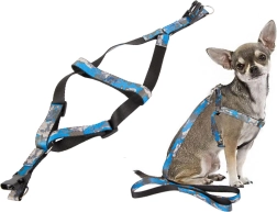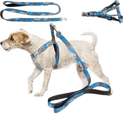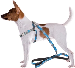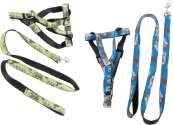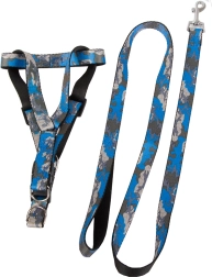 De lengte van het harnas stel je eenvoudig in met verstelbare kunststof gespen, en de riem klik je in een oogwenk vast of los dankzij de metalen karabijnhaak. De antislip handgreep zorgt voor een zekere grip, ook tijdens langere wandelingen. De set is ideaal voor kleine en middelgrote rassen en is verkrijgbaar in een modern camouflage-design in blauw of groen.