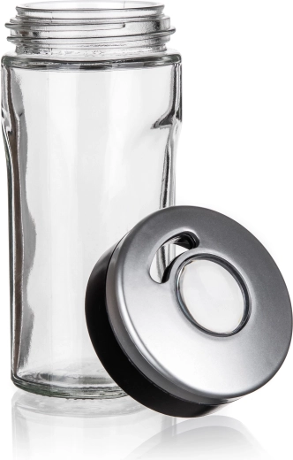 Praktische glazen kruidenpot VIRTU met een inhoud van 80 ml, voorzien van een duurzaam kunststof deksel met drie soorten doseeropeningen voor nauwkeurig kruiden. Ideaal voor fijn gemalen én grovere kruiden, en dankzij het universele deksel ook geschikt voor hele peperkorrels of kruidnagel. De glazen body is transparant voor snelle inhoudscontrole en kan in de vaatwasser worden gereinigd.