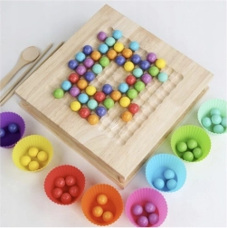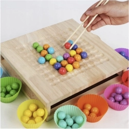 Werken met een pincet, stokjes en een lepeltje bij het hanteren van de balletjes ondersteunt een correcte greep, nauwkeurige bewegingen en concentratie – ideaal Montessori-leren door spel.