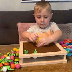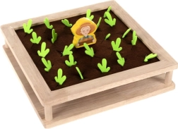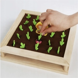 De set is rijk uitgerust: een houten boer, 80 balletjes, 24 vilten “gewassen”, 16 kaarten voor het geheugenspel, 8 siliconen bakjes voor sorteren, 2 houten stokjes en een lepeltje. Dankzij de kwalitatieve materialen is het spel veilig, duurzaam en prettig om aan te raken. Ideaal voor kinderen vanaf 3 jaar, voor in de kleuterklas en om thuis vaardigheden te oefenen.