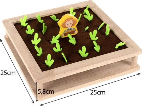 - 80 houten balletjes, 24 vilten gewassen, 16 memorykaarten, 8 bakjes, 2 houten stokjes, houten lepeltje, houten boer