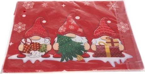 Fel rood, sneeuwvlokken en drie vrolijke kabouters met cadeaus toveren elke tafel om tot een knus, feestelijk middelpunt.