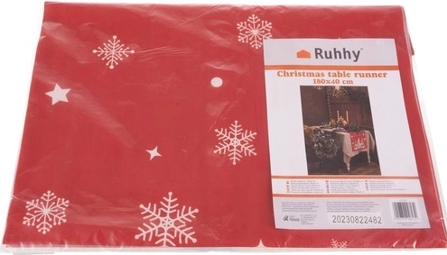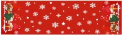 Elegante kerstloper in een diepe rode kleur die prachtig combineert met een wit tafelkleed en klassiek wit porselein. Het subtiele motief van witte sneeuwvlokken en sterren wordt aangevuld met kabouters met cadeautjes aan beide uiteinden, die het tafelen een speels feestelijk accent geven.