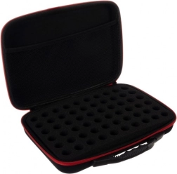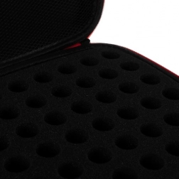Binnenin zit een nauwkeurige schuiminzet voor 60 flesjes (max. 10 ml) met afzonderlijke openingen van ongeveer 3 × 2 cm, aangevuld met een meshvak voor accessoires. Dankzij de doordachte indeling heb je alle tinten en toebehoren altijd bij de hand.