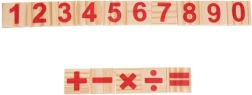 - 48 rekenstaafjes; 19 blokjes met cijfers; 5 blokjes met wiskundige symbolen; houten bakje