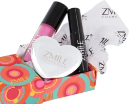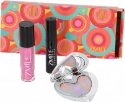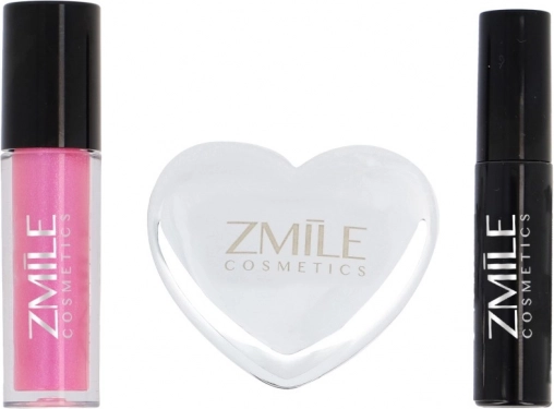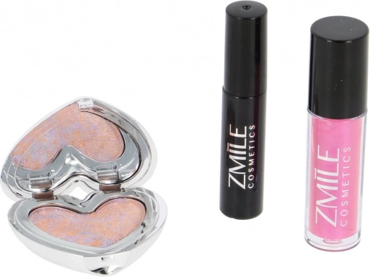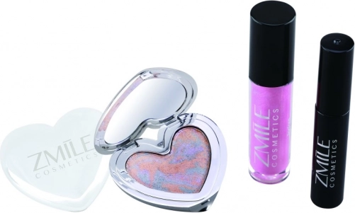 Drie producten – oogschaduws in een hartvormig palette, lipgloss en mascara – vormen een praktische set voor dagelijkse en avondmake-up.