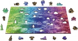 De houten puzzel Koraalrif 2-in-1 biedt een unieke puzzelervaring – aan de ene kant leg je op basis van het kleurrijke motief, aan de andere kant op basis van vormen met een herhalend patroon. Een deel van de stukjes heeft originele vormen van dieren, objecten of gebouwen en dankzij lasergeaccentueerde details voelen ze als kleine, op zichzelf staande figuurtjes.