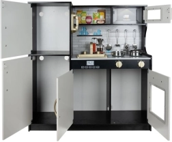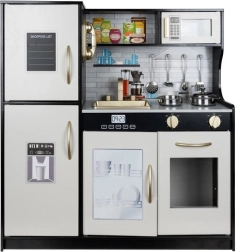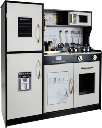 Stijlvolle houten XL keuken van KRUZZEL in zwart, wit en goud brengt kinderen realistisch kookplezier. Voorzien van LED-verlichting, geluidseffecten van de branders, bewegende elementen en rijk meegeleverd accessoires (pan, koekenpan, deksel, 4 lepels). Uitneembare gootsteen, oven, magnetron en opbergkastjes met “klik” stimuleren creativiteit, leren door te spelen en rollenspel.
