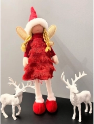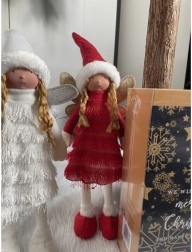 Deze betoverende engel-/elffiguur in het rood brengt de magie van Kerstmis in huis. De glanzende gouden vleugels weerkaatsen prachtig het licht en de winterse outfit met gebreide details, coljurk en mutsje met bont zorgt voor een warme, feestelijke uitstraling.