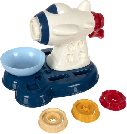 Een leuke “pasta”-machine in de vorm van een vliegtuig met handaandrijving. Plaats een opzetstuk, druk en er ontstaan verschillende pastavormen of decoraties van klei.