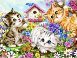 Maak een vrolijk schilderij met drie kittens in een bloeiende tuin. Het voltooide canvas fleurt een kinderkamer, woonkamer of kantoor op.