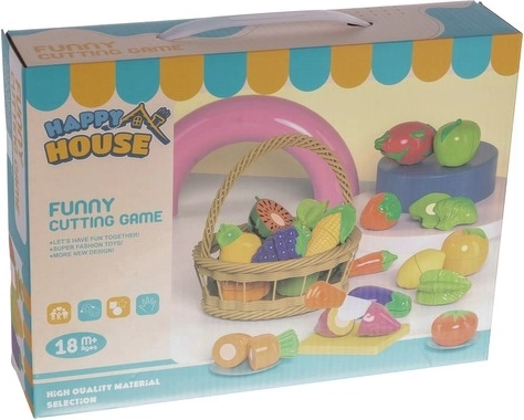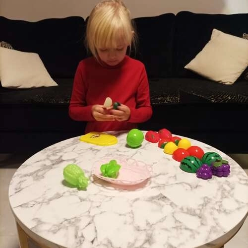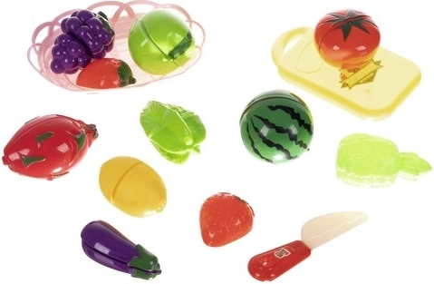 Deze kleurrijke set fruit en groenten is een geweldige aanvulling op een kinderkeuken. De delen zijn met klittenband verbonden, zodat kinderen ze veilig kunnen snijden met het meegeleverde mesje op de snijplank en daarna weer vastmaken. Realistische vormen en levendige kleuren trekken de aandacht en ondersteunen lerend spelen.