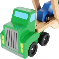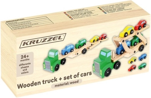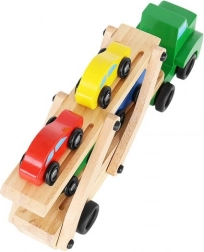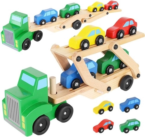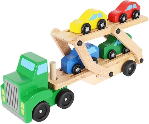 De houten autotransporter biedt realistische functies waar kinderen van houden – afneembare aanhangers, een opklapbaar bovendek voor eenvoudig oprijden en soepel rollende wielen. Vier autootjes in rood, blauw, geel en groen nodigen uit tot spelen, sorteren en racen en helpen tegelijk bij het herkennen van kleuren en de oog-handcoördinatie.