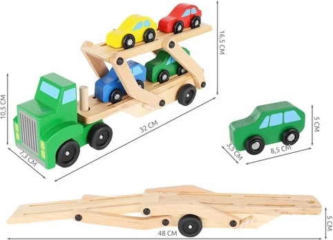 Het speelgoed is gemaakt van massief hout en gelakt met niet-giftige verven. Gladde, afgeronde vormen zorgen voor veilig gebruik, ook voor de allerkleinsten. Dankzij het tijdloze ontwerp is de autotransporter een geweldige toevoeging aan elke kinderkamer en gaat hij jaren mee.