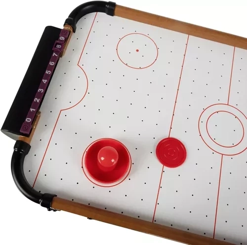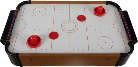 Deze mini airhockeytafel brengt groot plezier naar elke tafel. De compacte afmetingen maken spelen overal mogelijk – in de woonkamer, kinderkamer of op de vakantieboerderij. Het stabiele blad met een luchtkussen zorgt voor een soepele puckglij en een dynamisch spel zonder haperen.