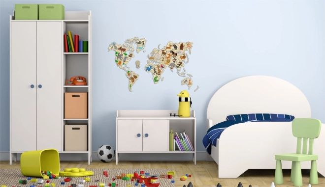 Ontdek de wereld op een speelse manier. De houten kaart met dieren op schaal 1:57 miljoen is met laser precisie uitgesneden uit berkenmultiplex, waardoor ze uitblinkt door strakke lijnen en de natuurlijke houtnerf. Perfect als decoratie én als leermiddel – kinderen breiden spelenderwijs hun kennis uit over continenten, oceanen en dieren.