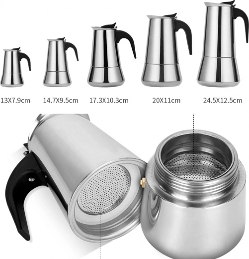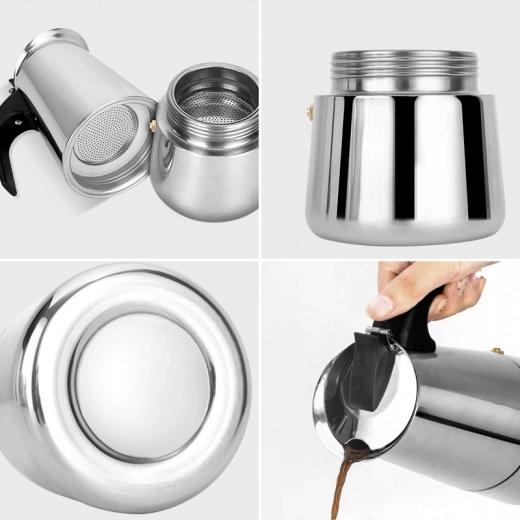 De capaciteit tot 12 kopjes maakt hem een praktische hulp voor het gezin en bezoekers. Het hittebestendige handvat vergemakkelijkt het schenken en het roestvrij staal garandeert een lange levensduur en weerstand tegen krassen. De koffiemaker kan worden gebruikt op gas- en elektrische fornuizen en kan na het zetten eenvoudig worden gedemonteerd en gereinigd.