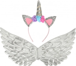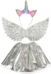 Dit prachtige kostuum laat je je kind veranderen in een unieke eenhoorn. Het bestaat uit een zilveren rok, elegante vleugels en een gedetailleerde diadeem met roosjes. Ideaal voor elke gelegenheid waarop je kind van een sprookjesspel kan genieten.