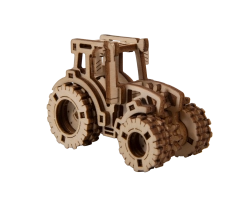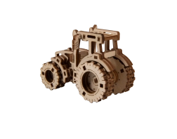Laser-gesneden elementen van triplex creëren een realistische uitstraling van de tractor met tandwielen en banden.