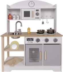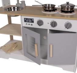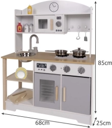 EERSTEKLAS - de keuken is gemaakt van hoogwaardig hout, wat de gebruiksduur, veiligheid en gezondheid van de kleintjes aanzienlijk beïnvloedt. Het is een tijdloos ontwerp dat elk kind zal bekoren. Dankzij het klassieke design is het altijd zeer gewaardeerd. De uitzonderlijk zorgvuldige afwerking met esthetische vormgeving en aandacht voor de kleinste details geeft het product extra waarde en is een lust voor het oog. De keuken kan ook een decoratieve functie vervullen en een sieraad zijn voor de kinderkamer.