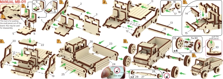 Voorgestanste onderdelen van kwalitatief multiplex passen precies in elkaar. Alles wordt aangevuld met een duidelijke, geïllustreerde handleiding, zodat zelfs beginners het kunnen bouwen.