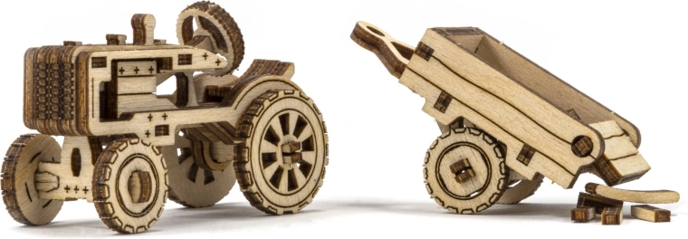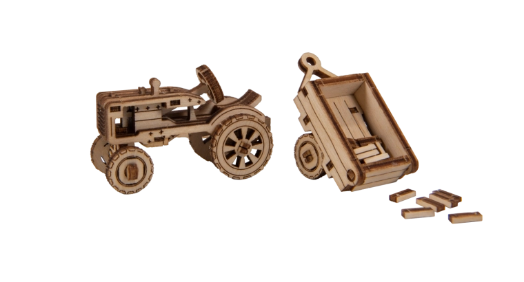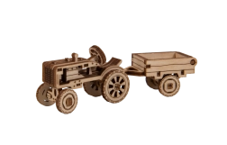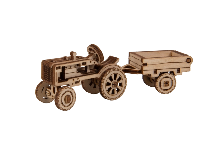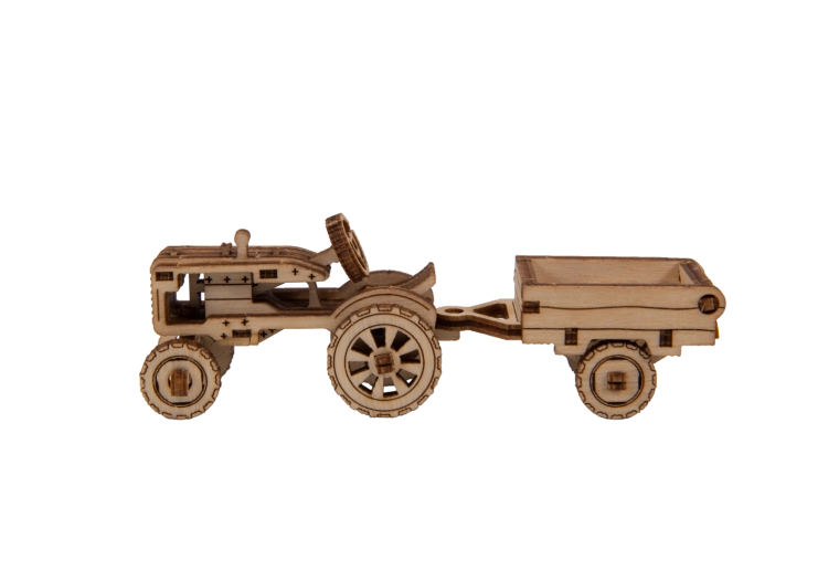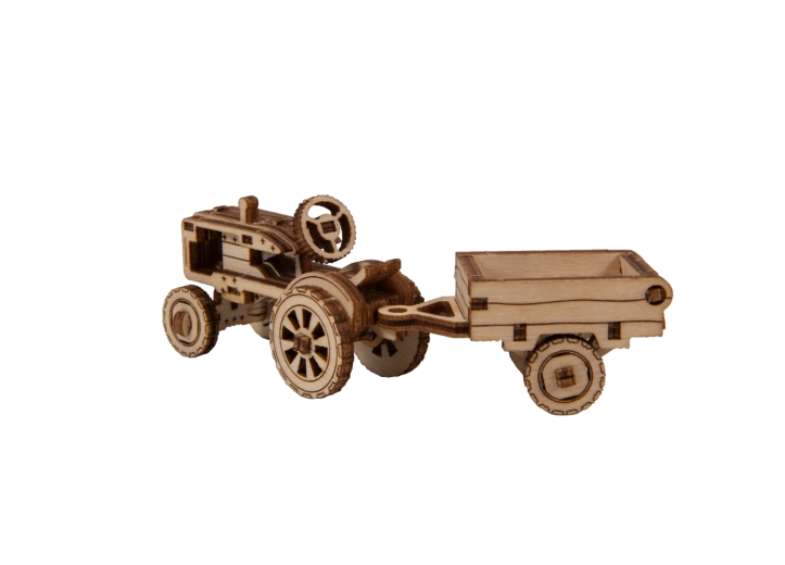 Het tractormodel met aanhanger heeft bewegende wielen en rijke gegraveerde details. De aanhanger kan kantelen – ideaal als indrukwekkende houten decoratie.