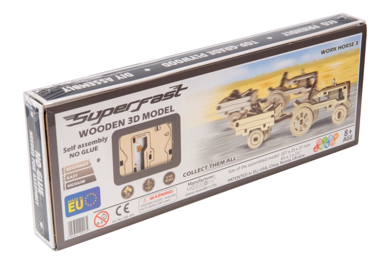 Dit nauwkeurig uitgewerkte model “Work Horse 3” is geïnspireerd op beroemde Amerikaanse tractors en biedt een aantrekkelijke mix van creatieve fun en ontspanning. De onderdelen zijn laser-voorgestanst, dus je hebt geen lijm nodig en geen schroeven – alles klikt schoon in elkaar en het resultaat is een realistische tractor met kantelbare aanhanger.
