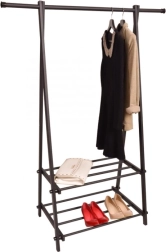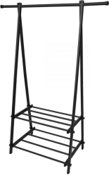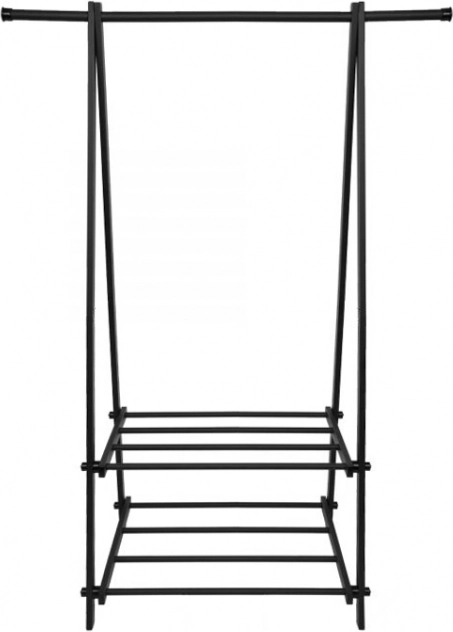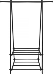 Dit compacte en lichte kledingrek helpt orde te houden in kleding en accessoires. Het minimalistische design past moeiteloos in moderne interieurs en biedt voldoende ruimte voor jassen, overhemden en vesten, terwijl de twee planken plaats bieden aan schoenen, dozen of handtassen.