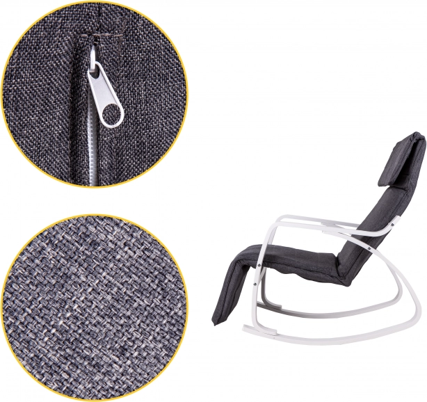 De schommelstoel van ModernHome is ontworpen voor maximaal comfort en rust. De stevige metalen constructie in wit is aangevuld met grijze textielbekleding, die een gezellige zitplek biedt. Dankzij de vijftraps verstelbare voetensteun kunt u eenvoudig de ideale positie instellen.