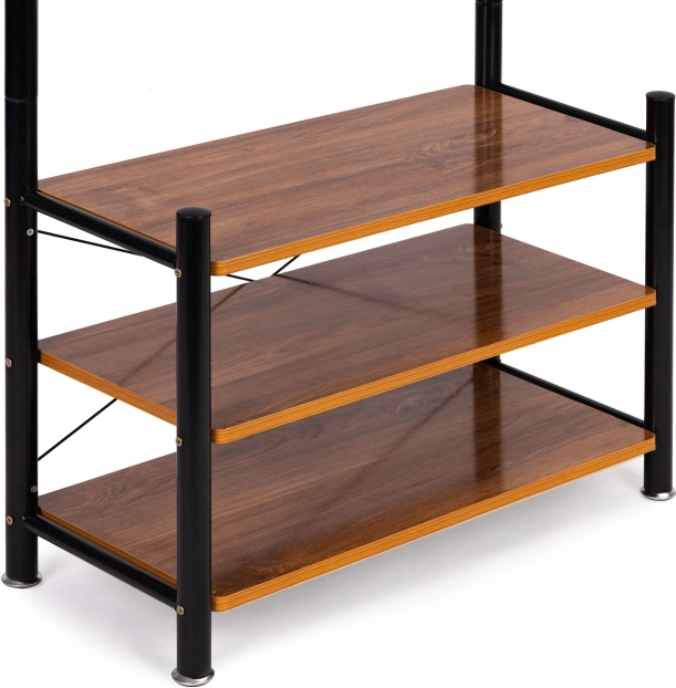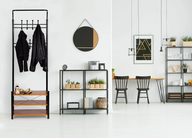 De metalen constructie op vier poten garandeert stabiliteit, zelfs bij zware belasting. Het moderne en universele ontwerp van de hanger past in elk interieur, en dankzij de beschermkappen wordt de vloer beschermd tegen krassen.