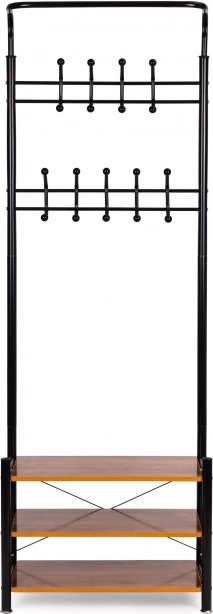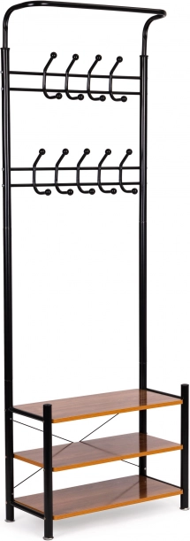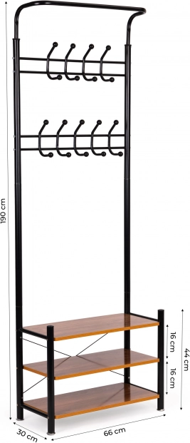 Het bovenste gedeelte heeft twee rijen met 18 haken, wat de hanger ideaal maakt voor thuisgarderobes, kantoren of wachtruimtes. Het onderste gedeelte bevat drie functionele planken voor kleinere items, tassen of schoenen. Stabiliteit wordt gegarandeerd door een vierpotige metalen basis.