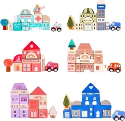Houten blokken voor kinderen ouder dan 3 jaar zijn ideaal voor de ontwikkeling van handmatige vaardigheden en ruimtelijk inzicht. De set bevat 115 elementen, waaronder diverse gebouwen zoals hotel, ziekenhuis, bank, politiebureau, school en brandweerkazerne. Elk gebouw is gedetailleerd ontworpen en aangevuld met een bijpassend voertuig.