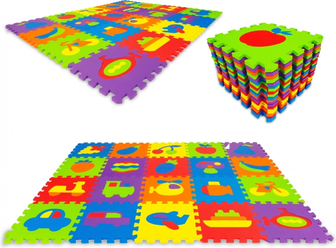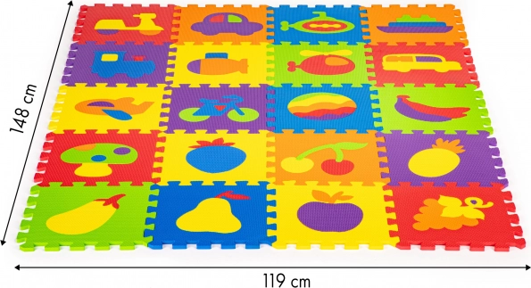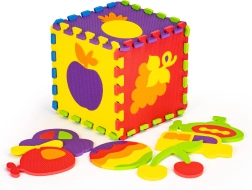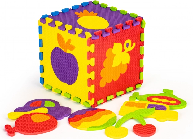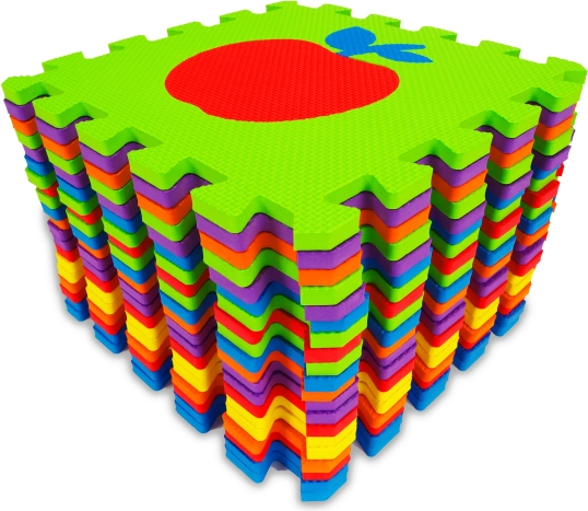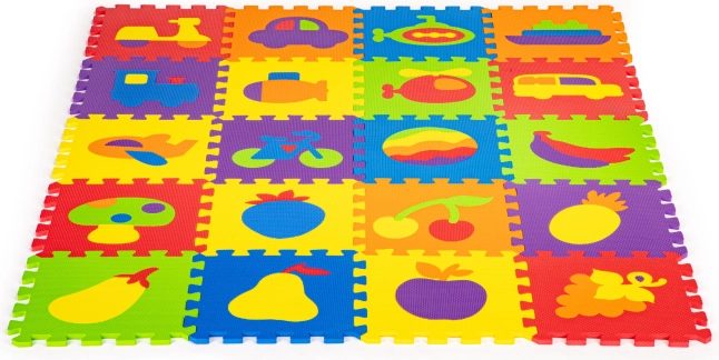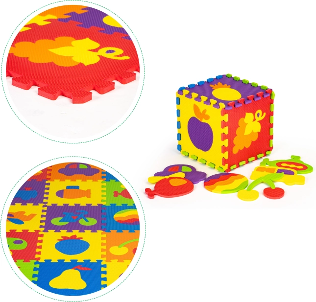 Puzzelsluitingen maken een flexibele indeling mogelijk – leg hem neer als speelzone of bouw van de delen blokjes en torens. Inzetten met fruit- en voorwerpmotieven zijn uitneembaar, zodat kinderen vorm- en kleurherkenning, fijne motoriek en logisch denken trainen. Het antislipoppervlak zorgt voor stabiliteit, het EVA-materiaal is veilig en gemakkelijk af te wassen.