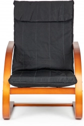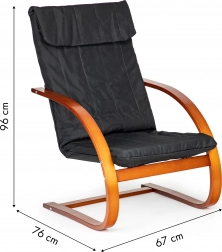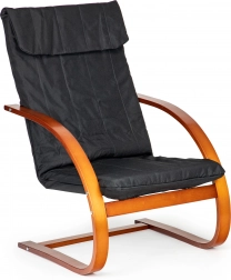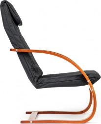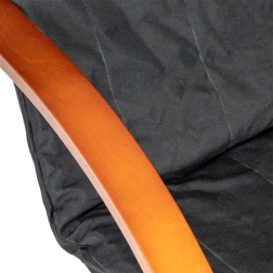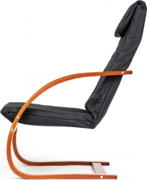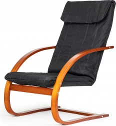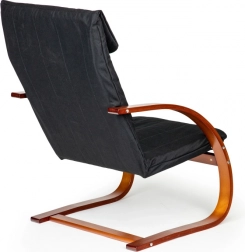 Geniet van momenten van rust in een stoel die modern design met ergonomie combineert. Het schommelmechanisme kalmeert en verlicht de rug, terwijl de zachte bekleding met schuimvulling zorgt voor comfort tijdens lezen, relaxen of tv-kijken. Het contrast tussen zwarte stof en notenhout accentueert het karakter van elk interieur.