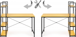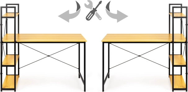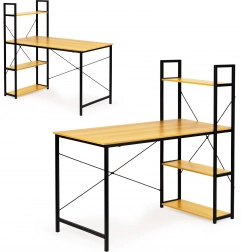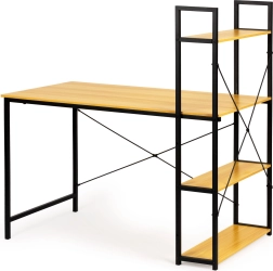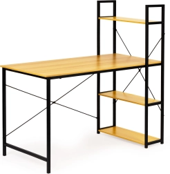 De tafel biedt een ruim werkoppervlak en een zijstandaard met vier planken voor het opbergen van boeken, documenten of decoraties. De volledige constructie is ontworpen met het oog op duurzaamheid en een lange levensduur, dankzij materialen zoals MDF-plaat en poedergecoat staal.