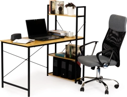Als u op zoek bent naar een combinatie van modern design en functionaliteit, dan is deze computertafel met loft-planken een ideale keuze. Het werkblad van natuurlijk hout, ondersteund door een zwart metalen frame, geeft uw thuiskantoor of werkplek zowel stijl als praktische waarde.