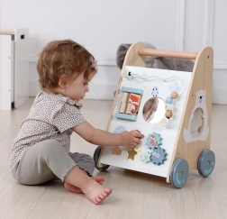 Op de voorzijde bevat de loopwagen veel speelgoed dat de fijne motoriek van je kind ontwikkelt.