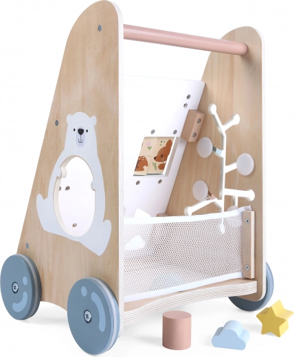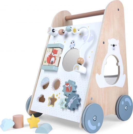 De houten loopwagen voor kinderen vanaf 18 maanden biedt niet alleen hulp bij het leren lopen, maar ook veel plezier en ontwikkeling van de fijne motoriek. Het educatieve paneel bevat: