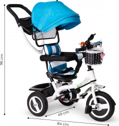 Duurzame wielen en een veiligheidsrem op de achterwielen zorgen ervoor dat de driewieler niet ongecontroleerd begint te rollen. De zitting kan worden gedraaid om de ouder te zien of naar voren voor het observeren van de omgeving, wat plezier biedt tijdens de wandeling en ideaal is voor oudere kinderen. Ze houden van de massagekop voor rug- en nekwervels.