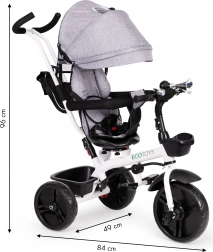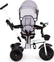 De duwstang laat een volwassene de driewieler comfortabel leiden en sturen. 5-puntsgordels, een beschermbeugel en een parkeerrem op de achterwielen houden de rit onder controle.