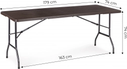 De MODERNHOME-tafel combineert een robuuste afwerking met praktische afmetingen van 180 × 74 cm voor comfortabel serveren, werken en vrije tijd. Het stalen frame met verstevigingen en vergrendelingen garandeert stabiliteit, rubberen doppen beschermen de vloer tegen krassen. Het HDPE-blad is bestand tegen weersinvloeden, is gemakkelijk te reinigen en voelt dankzij de 4 cm dikte stevig en stabiel aan.
