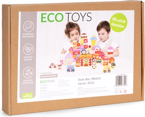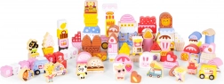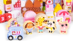 Bouw een zoete stad vol ijssalons, pâtisserieën en schattige details. Kleurrijke houten blokken met prints van eten, cijfers en letters ondersteunen spelenderwijs leren – tijdens het bouwen oefenen kinderen vanzelf het herkennen van vormen, kleuren en symbolen.