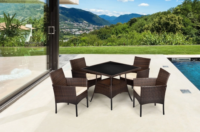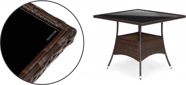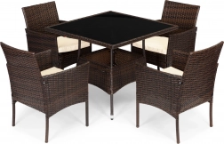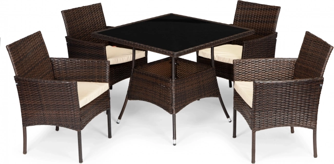 Ervaar comfort en stijl in uw tuin met ons rattanstel Pregasio. Deze elegante set bevat vier comfortabele stoelen die optimale rugondersteuning bieden en een praktische tafel met een veilig gehard glazen blad.