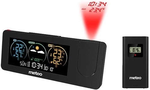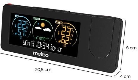 Het digitale weerstation METEO biedt een complete oplossing voor het meten van temperatuur en luchtvochtigheid, zowel binnen als buiten. Het is uitgerust met een projector die belangrijke informatie zoals tijd en temperatuur op een gekozen oppervlak in de kamer weergeeft.